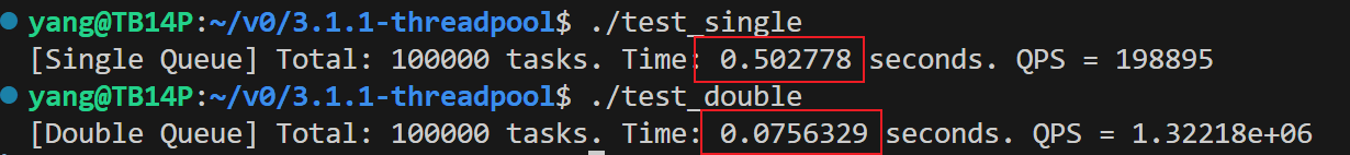 分别跑single(单队列)和double(双队列),输出总耗时和QPS。